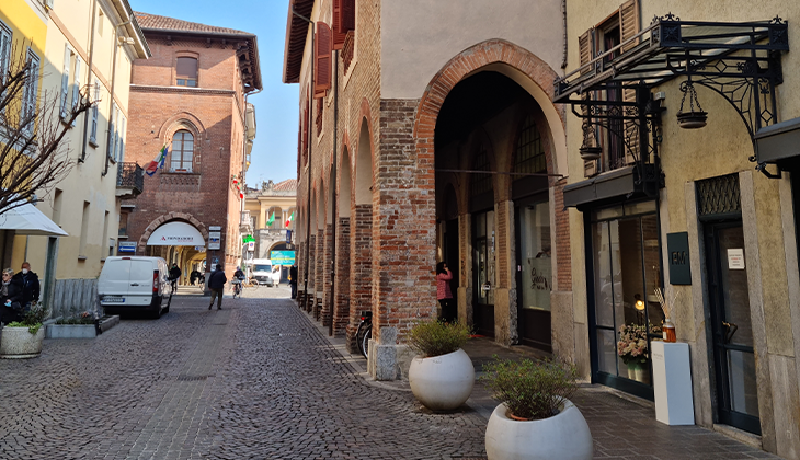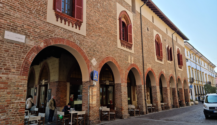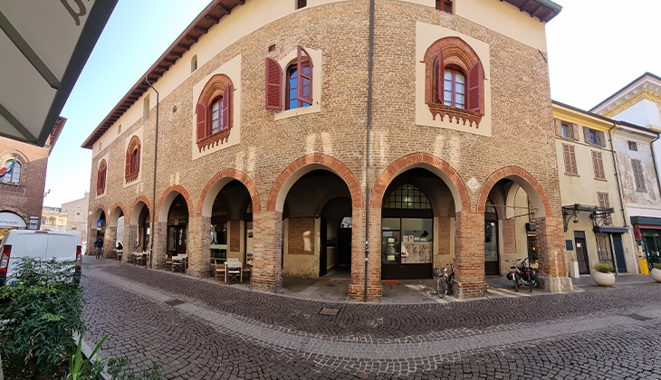 Il Palazzo Vistarini è situato all'angolo tra Piazza della Vittoria e Corso Vittorio Emanuele II. Costruito nel Trecento, il palazzo originariamente fungeva da residenza fortificata per l'influente famiglia ghibellina dei Vistarini, dalla quale prende il nome. Nel corso dei secoli, l'edificio ha subito numerosi rimaneggiamenti e rifacimenti che ne hanno modificato l'aspetto originale. Prima del 1698, il palazzo si estendeva ben oltre l'attuale configurazione, arrivando a occupare un'area molto più vasta che comprendeva parte dell'attuale Corso Vittorio Emanuele II. Tuttavia, a seguito delle difficoltà politiche e finanziarie della famiglia Vistarini, l'edificio venne acquisito nel 1698 dal Giovanni Paolo Barni, che lo trasformò in una dimora privata. L'edificio conserva ancora oggi tracce del suo antico splendore, con una facciata in stile gotico, caratterizzata dall'uso di mattoni e abbellita da monofore decorate con cornici in cotto, e da eleganti archi a sesto acuto che adornano il portico sottostante. All'interno, alcuni affreschi originali sulle volte e nel portico testimoniano la ricchezza artistica del palazzo, che, grazie alla sua grande altezza, doveva consentire, per decreto dei decurioni cittadini, il passaggio di un uomo a cavallo. Il portico conserva intatta l'altezza del soffitto, uno degli aspetti distintivi dell'edificio, che conferisce a Palazzo Vistarini un aspetto imponente e suggestivo.